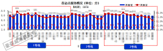 根據(jù)指標體系的建立,豪森威完善了問卷設(shè)計,對天津地鐵各線路以及各站點服務(wù)進行了全面調(diào)研。根據(jù)滿意度測評分數(shù)得出,服務(wù)表現(xiàn)最好的是天津地鐵2號線,同時,豪森威發(fā)現(xiàn)各線路的服務(wù)表現(xiàn)存在較大差異,以3號線各站點的服務(wù)表現(xiàn)最為參差不齊。